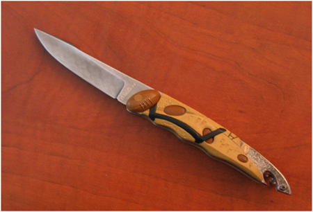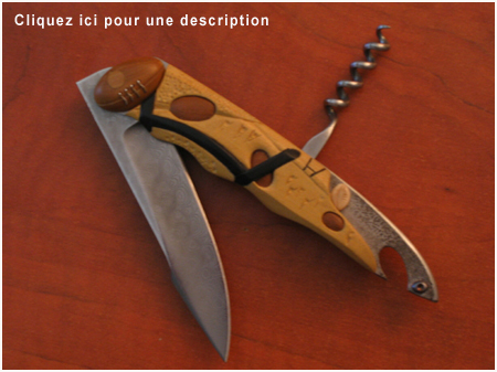 Ce couteau fait aussi fonction de décapsuleur et de tire-bouchon, un petit cure dent en ivoire de mammouth est caché dans le manche.