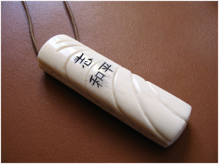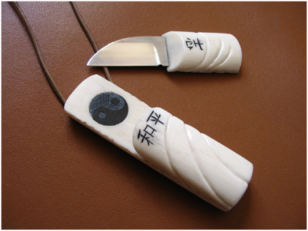 Ambition Paix est un couteau-bijoux en os de buffle sculpté.
