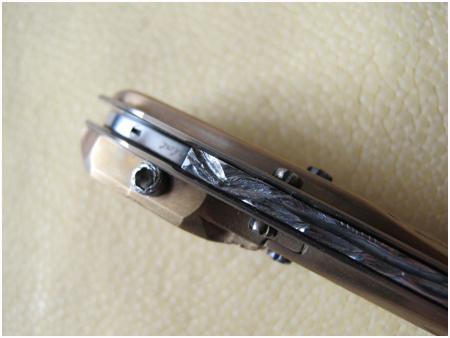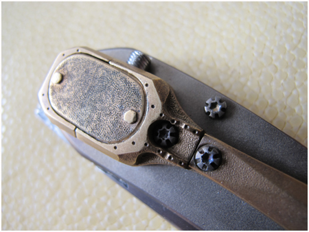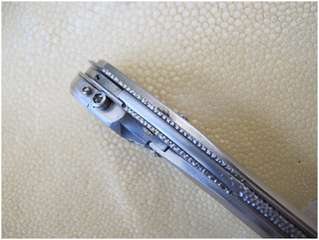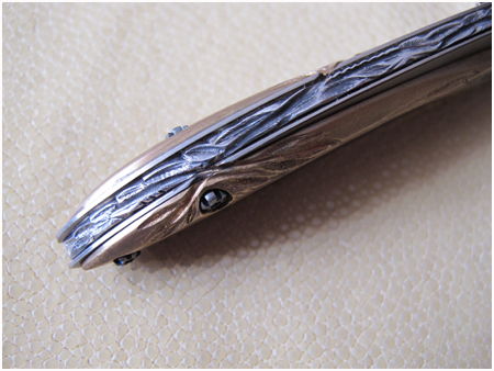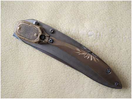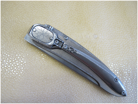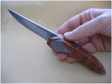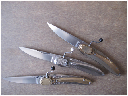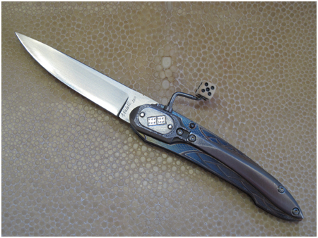 Il résume toutes les recherches mécaniques et esthétiques que j’ai effectuées depuis mes débuts, il est possible de transposer facilement ce mécanisme sur d’autres design de couteaux de ma fabrication.