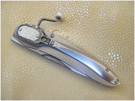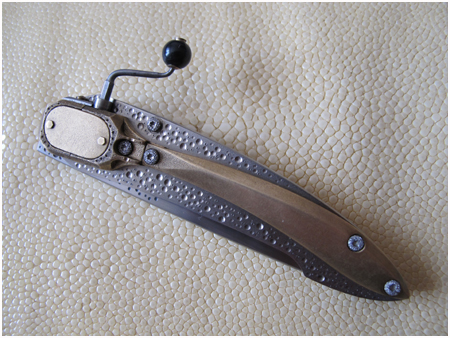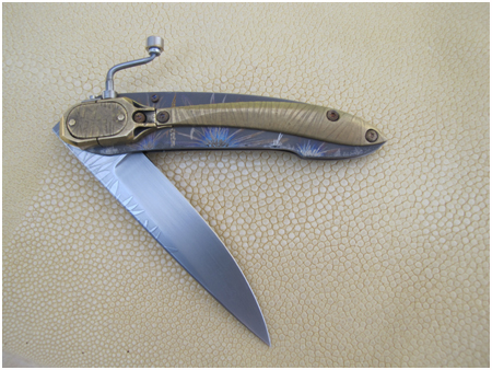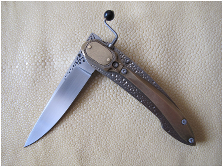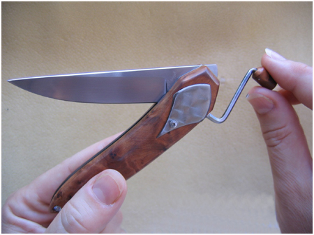 Après 5 ans de recherche, j’ai mis au point et intégré dans une très faible épaisseur (14 mm au plus épais) une vis sans fin irréversible à commande tangentielle. Le couteau, ambidextre, ne peut s’ouvrir ou se fermer qu’avec sa manivelle.