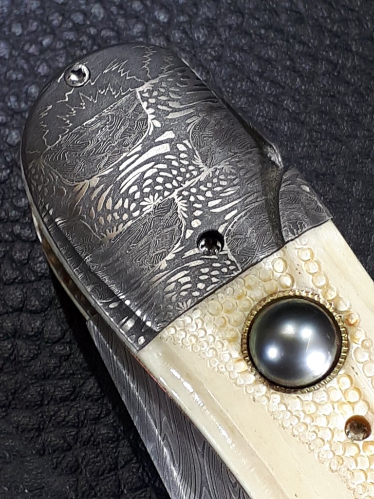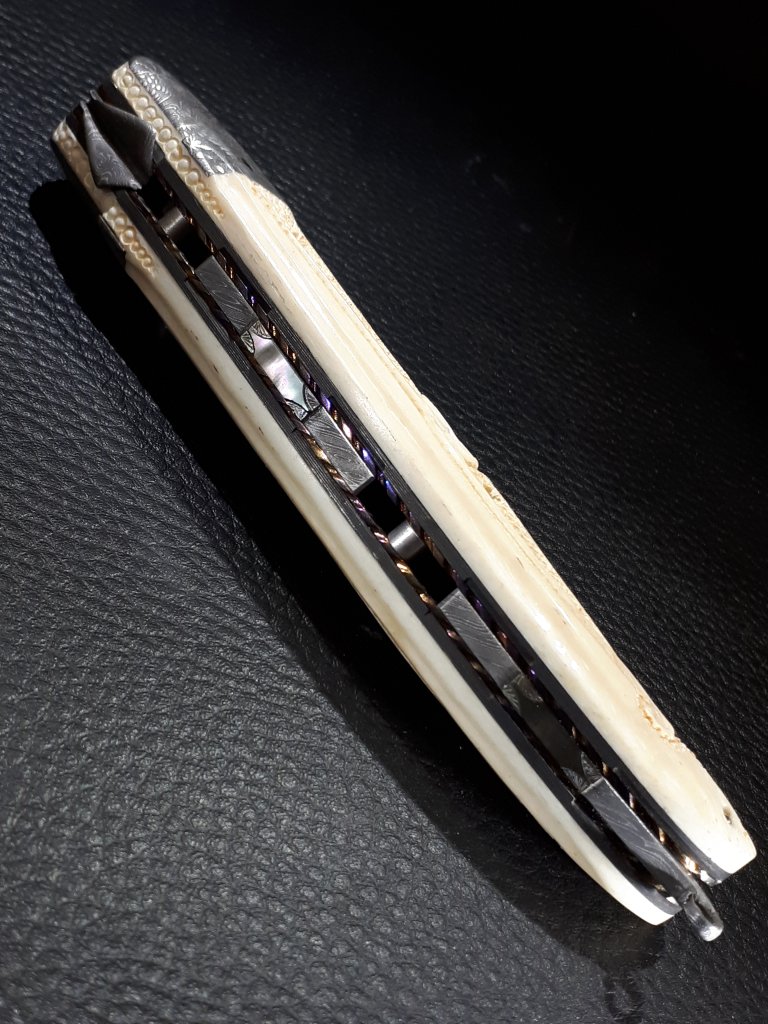 Le dos du couteau est décoré avec des pièces en damas et en nacre de Tahiti assemblé en queue d’aronde. « L’abeille » est représentée par un morceau de damas refendu.