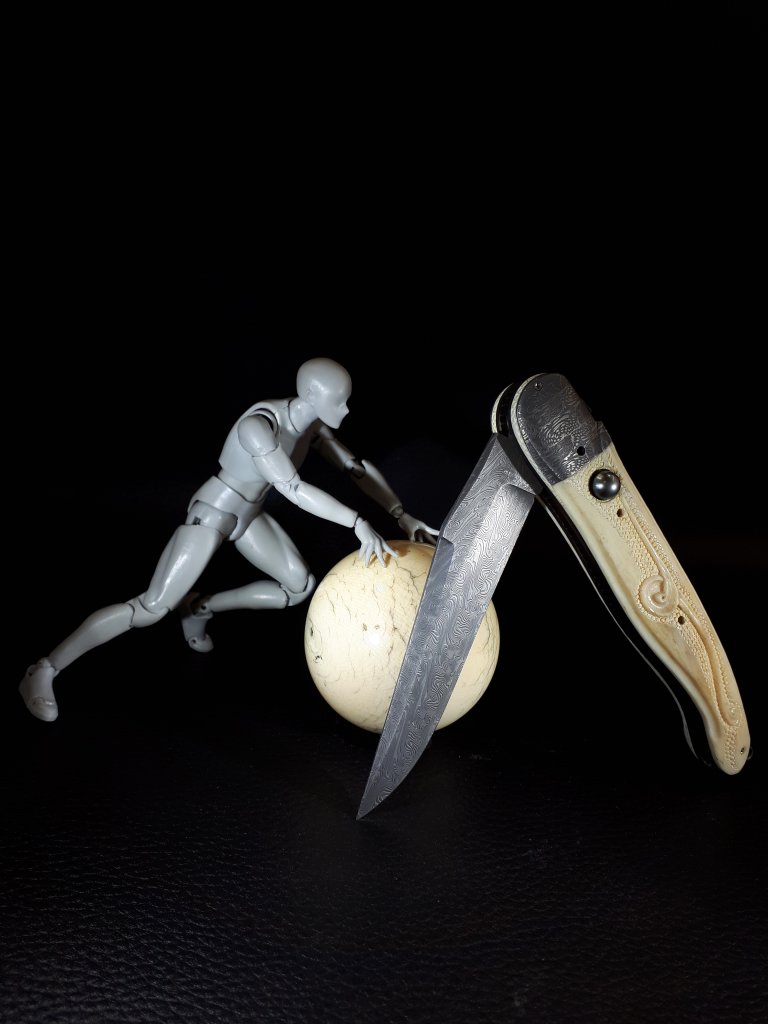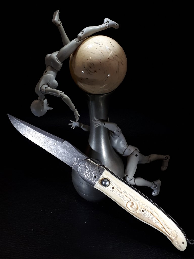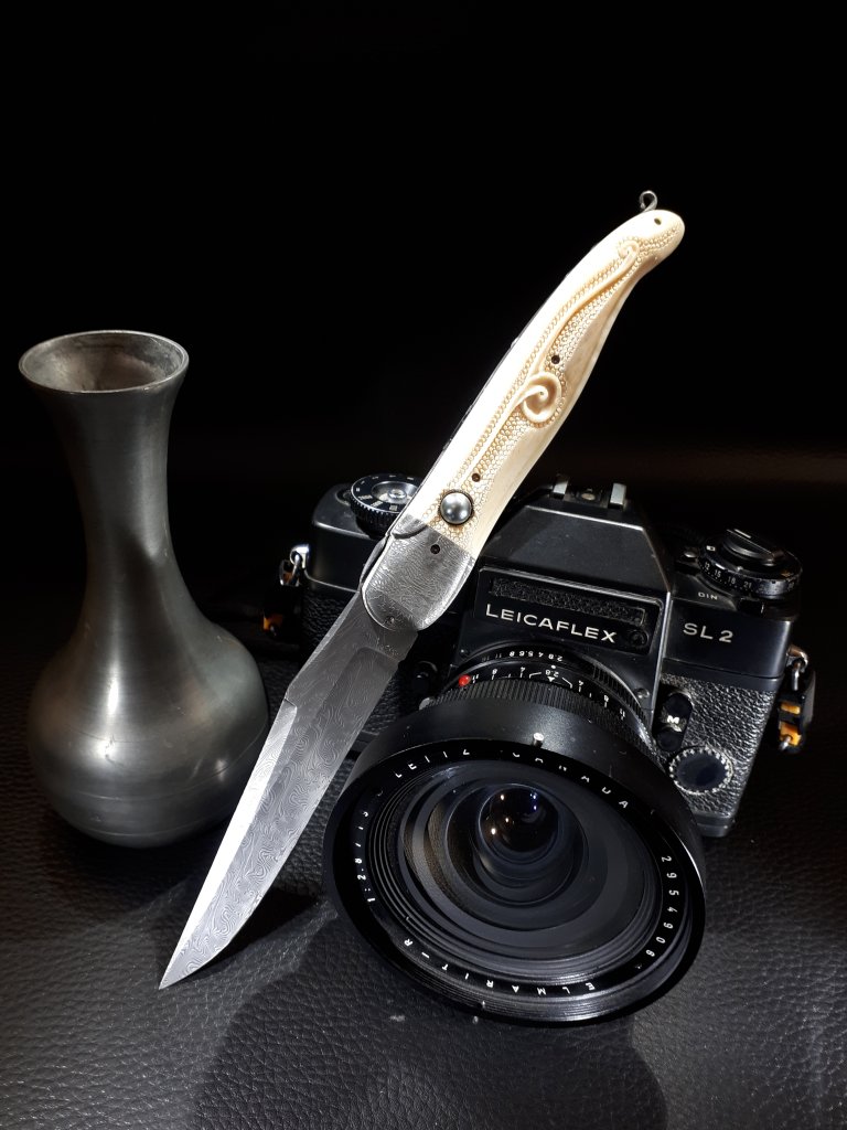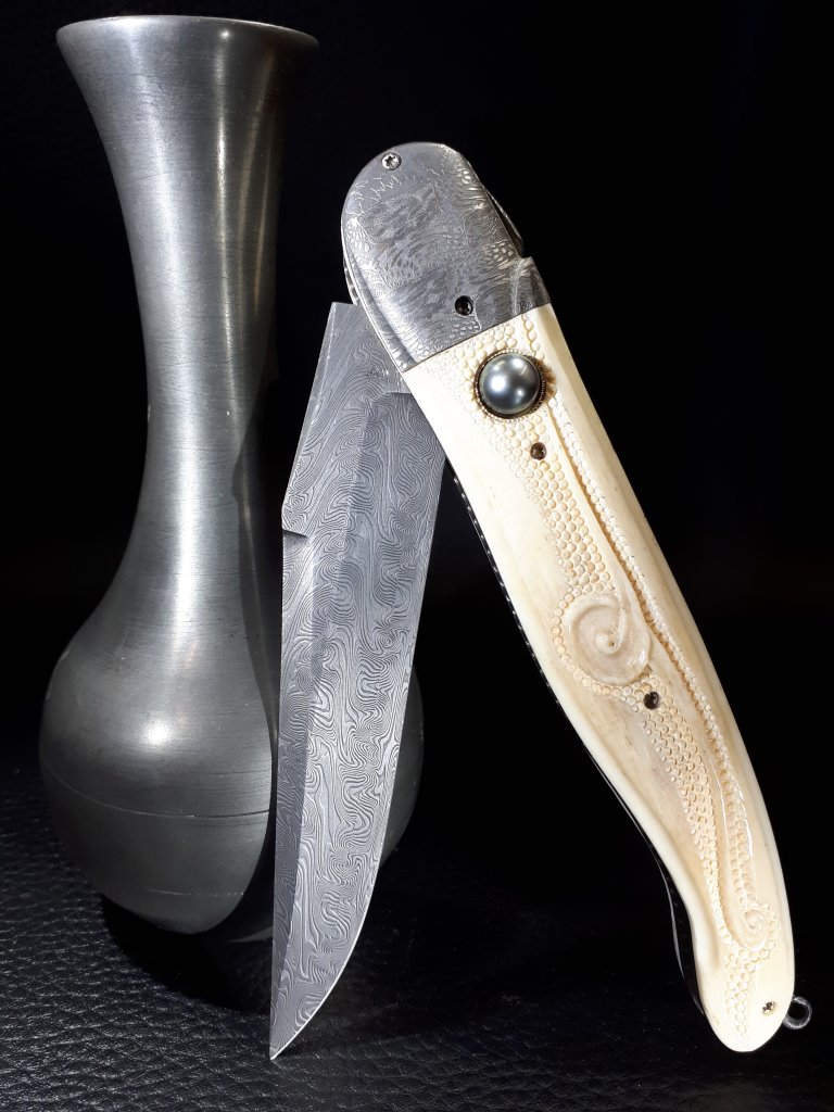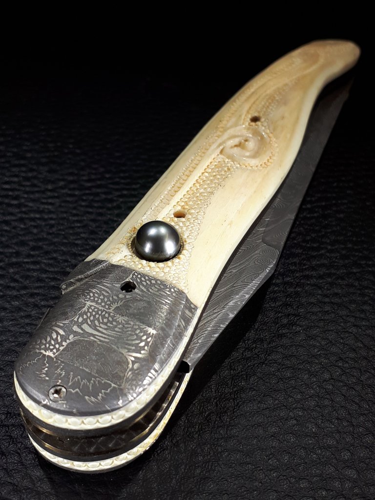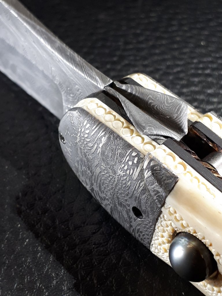 La lame est en damas carbone torsadé, le manche est en os de girafe gravé et ciselé, insert d’un intercalaire en fibre de carbone, les platines sont en titane coloré / bouchonné. Les mitres sont taillées dans un damas mosaïque. L’ensemble est vissé et entièrement démontable.