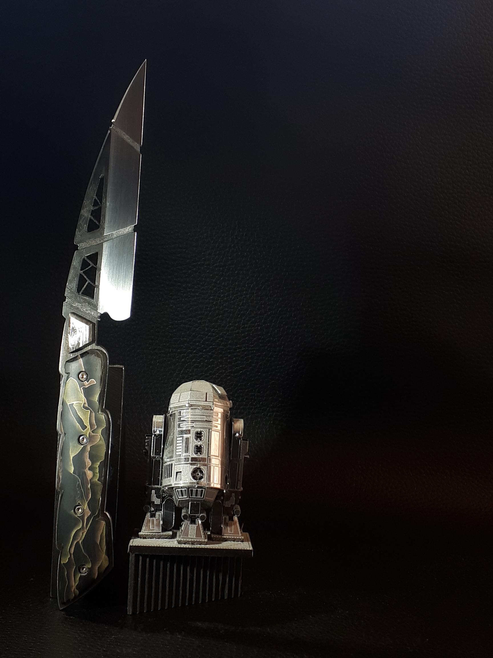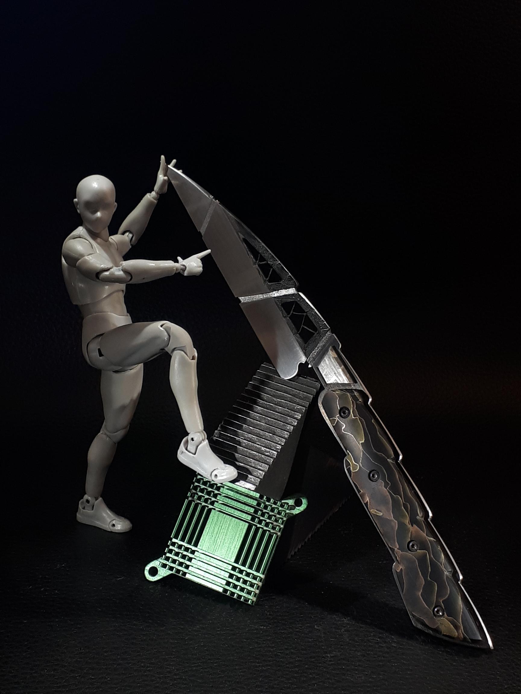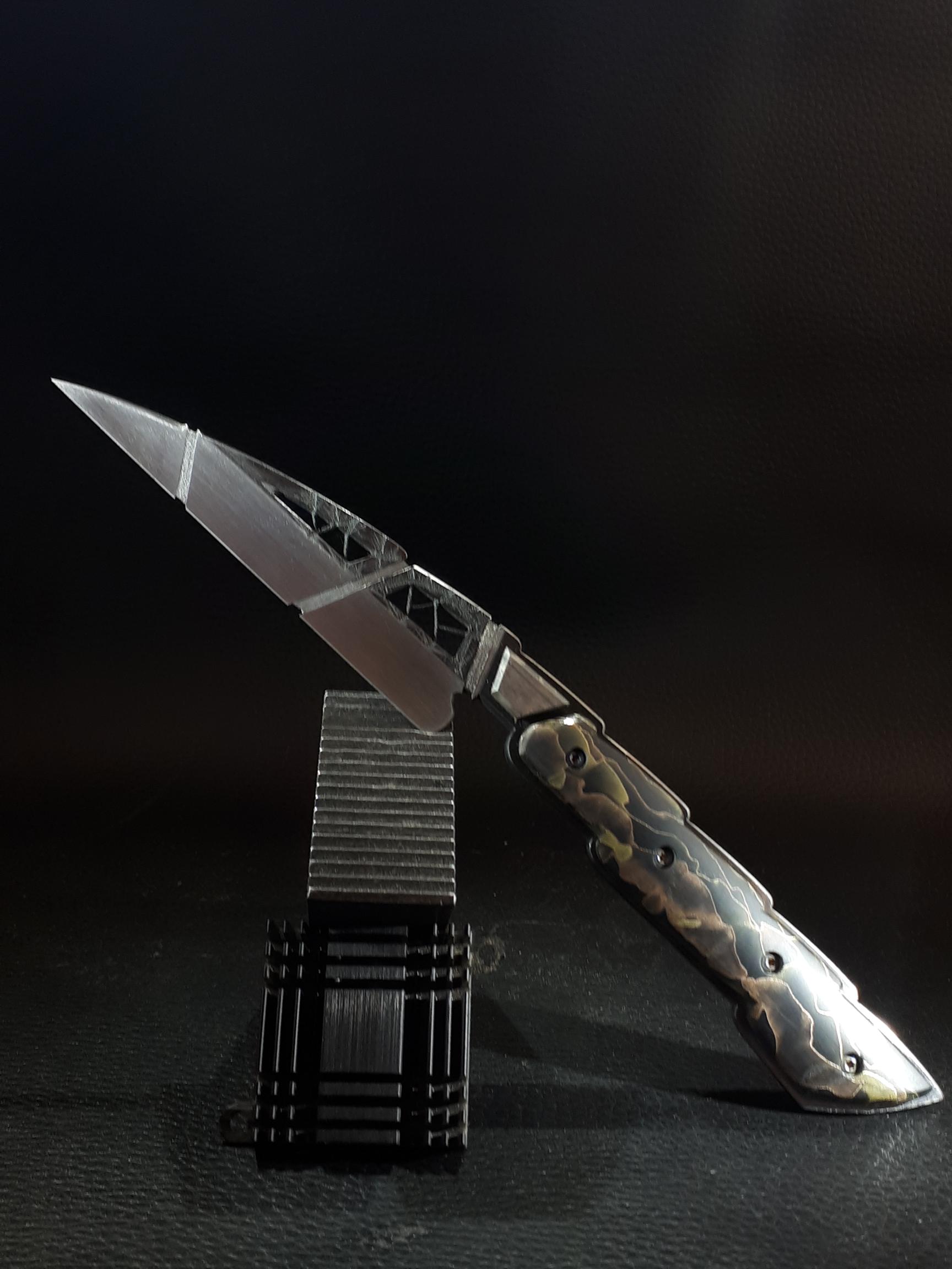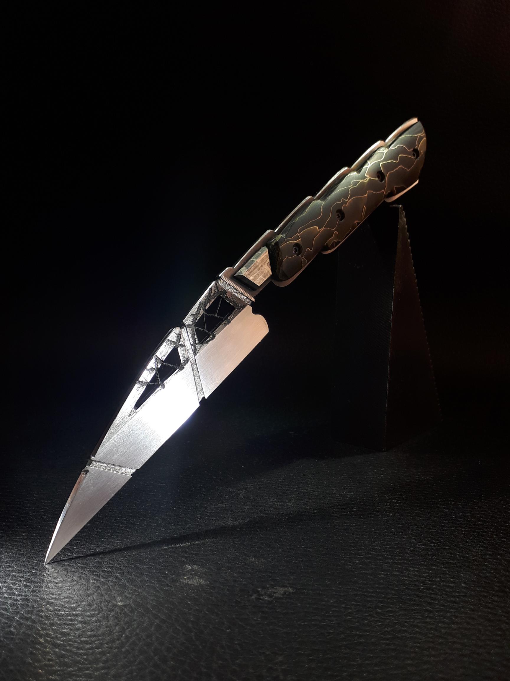Couteau d’Art fixe " Sylphe" Article mis en ligne le 2 octobre 2021 dernière modification le 10 novembre 2021 Pièce unique faite main . Lame ajourée et ciselée manche en matière synthétique " allure", microgrillage laiton et cuivre noyé dans de l’époxy. Mitre en météorite. Création originale