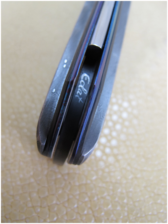 - Sa lame de 8,5 cm est en acier inoxydable Suédois 12C 27. Comme tous les “éclats”, elle a la particularité d’être satinée, tirée en long et elle pivote autour d’un axe de 6mm flanqué de rondelle nylon.