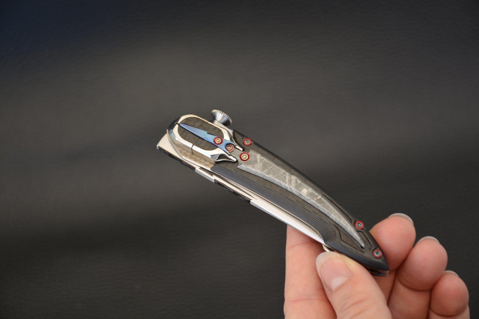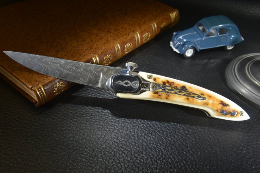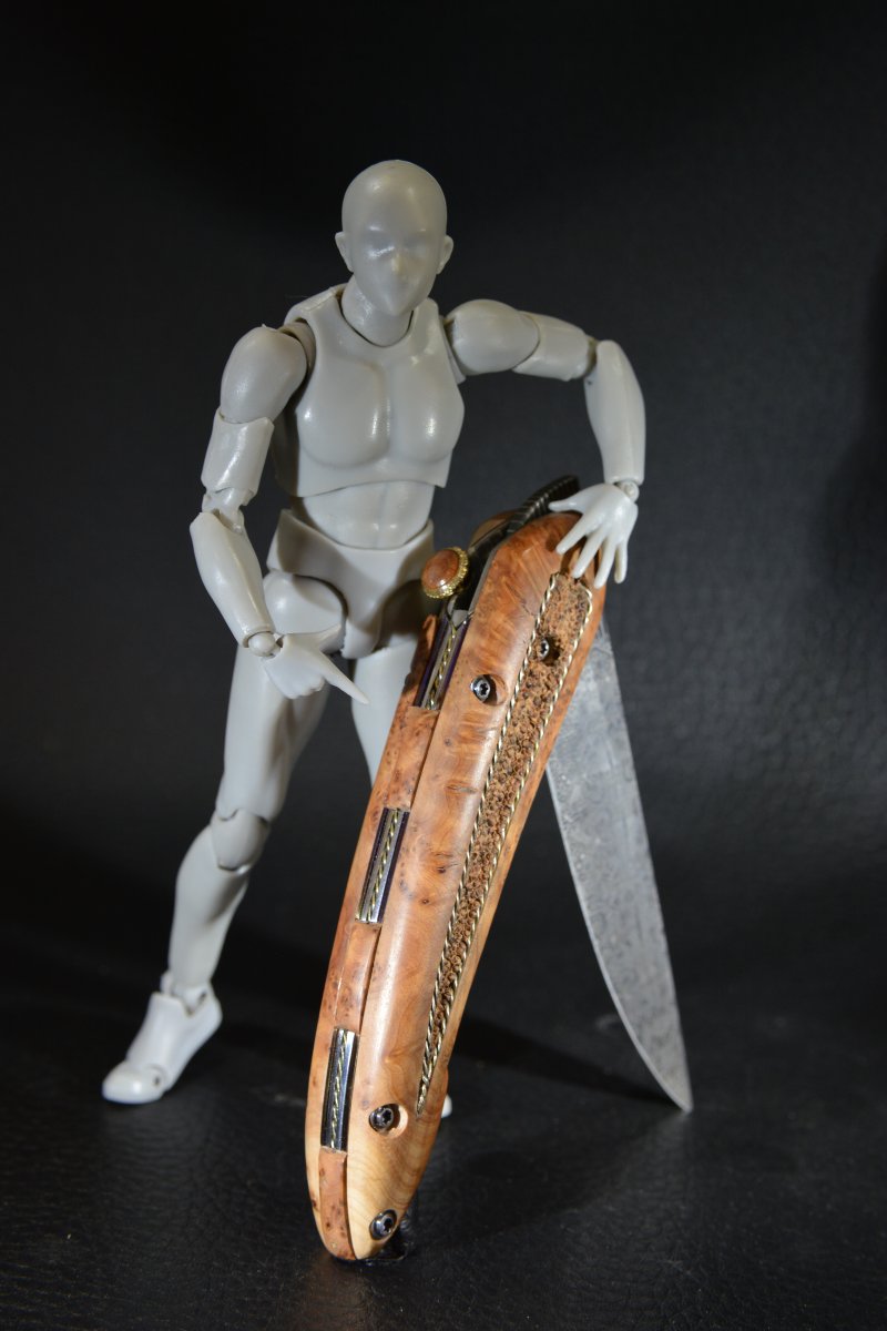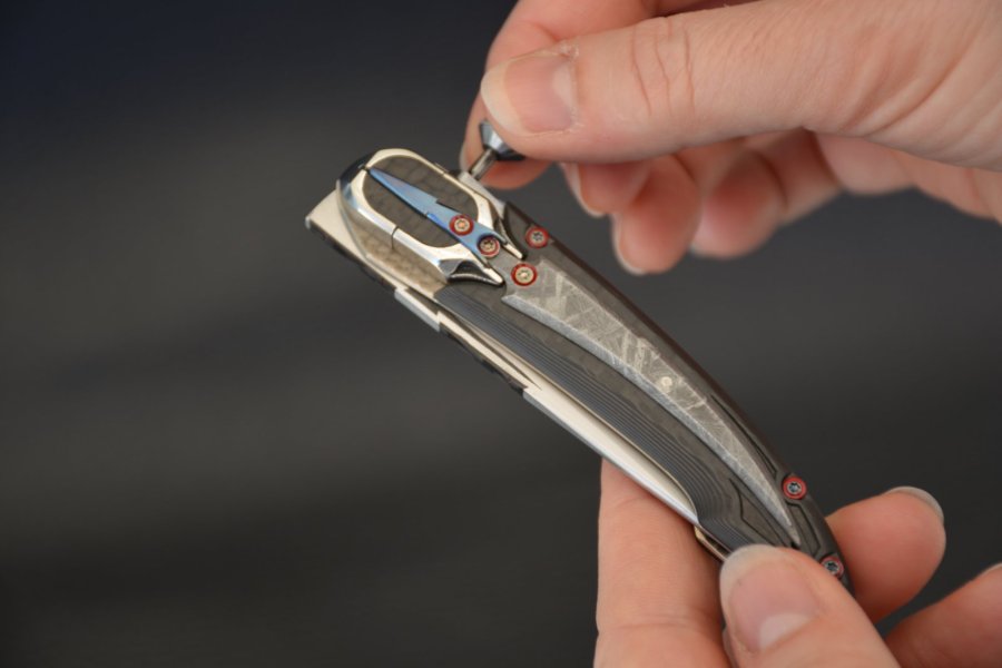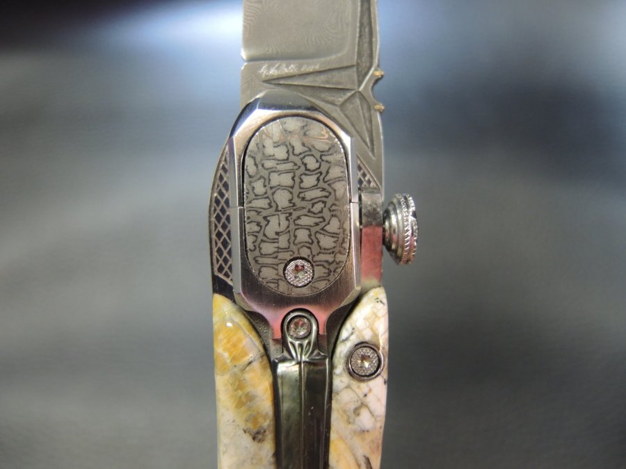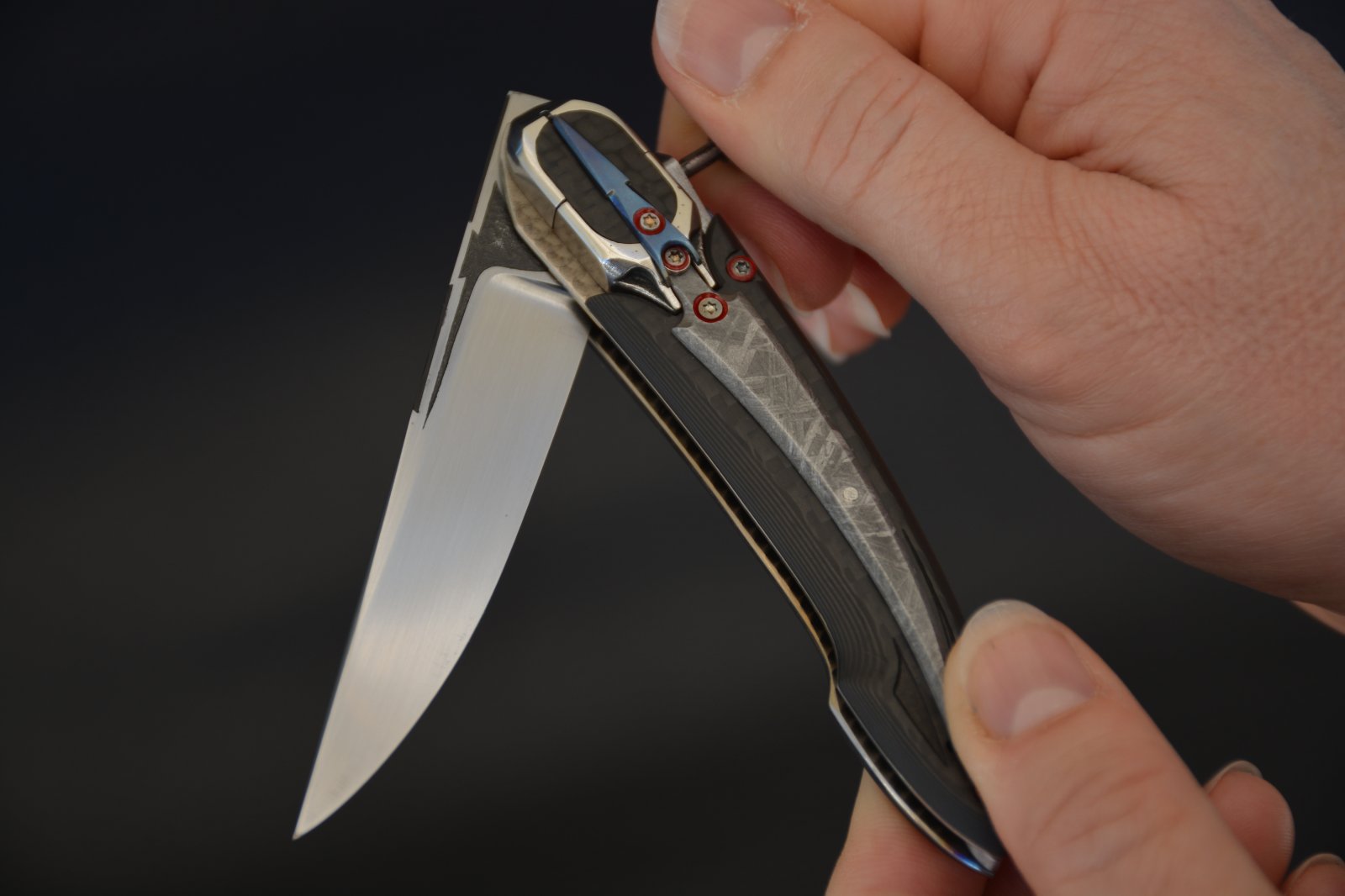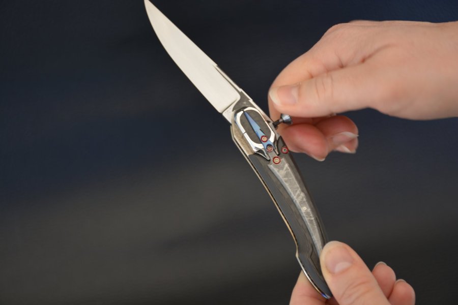 2 ans de réflexions, de tests et d’essais pour fabriquer un bouton escamotable comme celui utilisé pour la mise a l’heure sur les montres de dimension suffisante pour ne pas forcer lors de l’ouverture/fermeture, ne pas gêner la prise en main et l’utilisation du couteau…