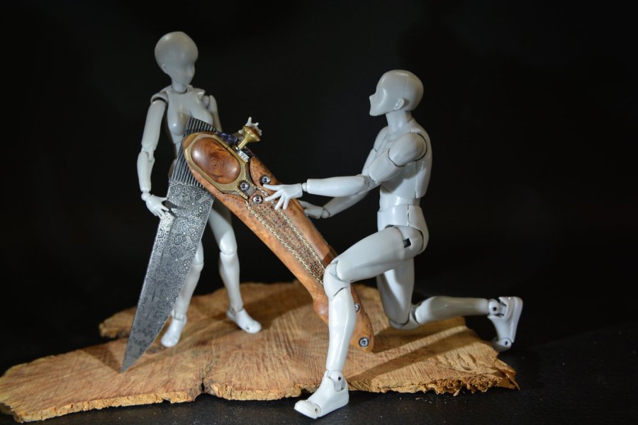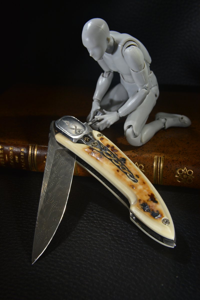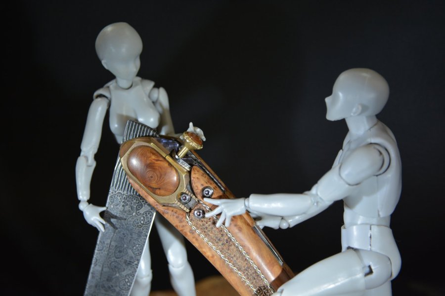 Chaque création est unique et mer demande un peu plus de temps travail que les précédents. Il me faut entre 140 et 200 heures de travail pour mener à bien un projet, fonction des gravures, ciselures et matériaux que j’utilise.