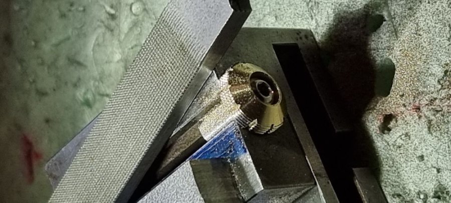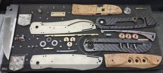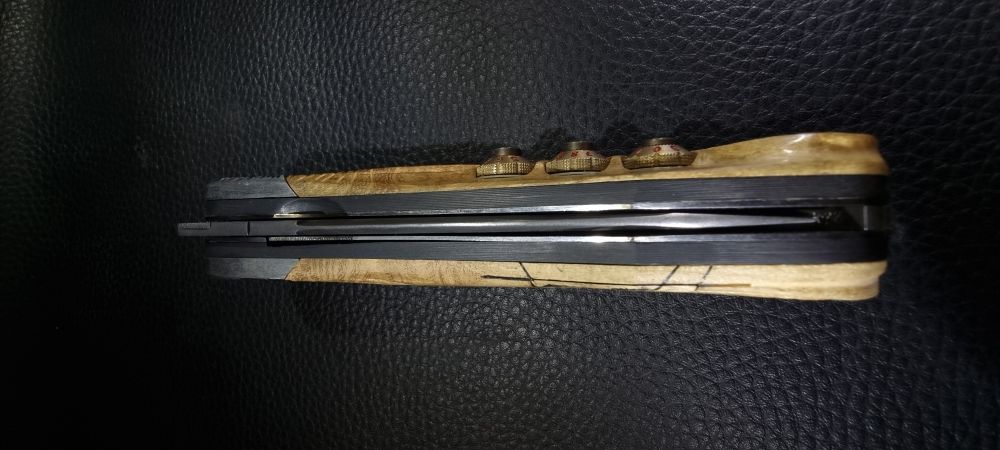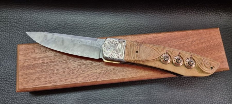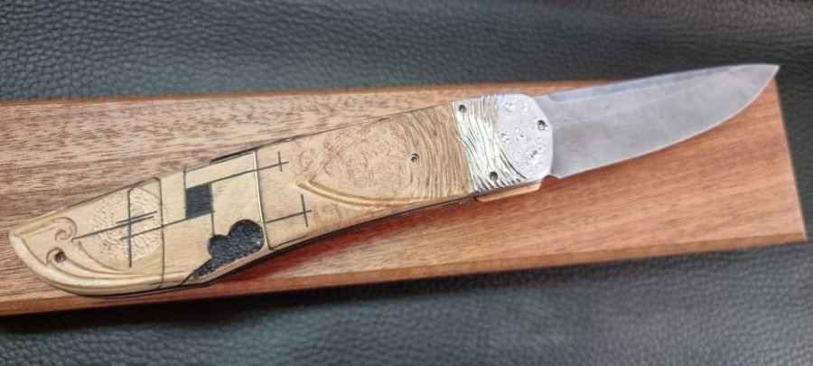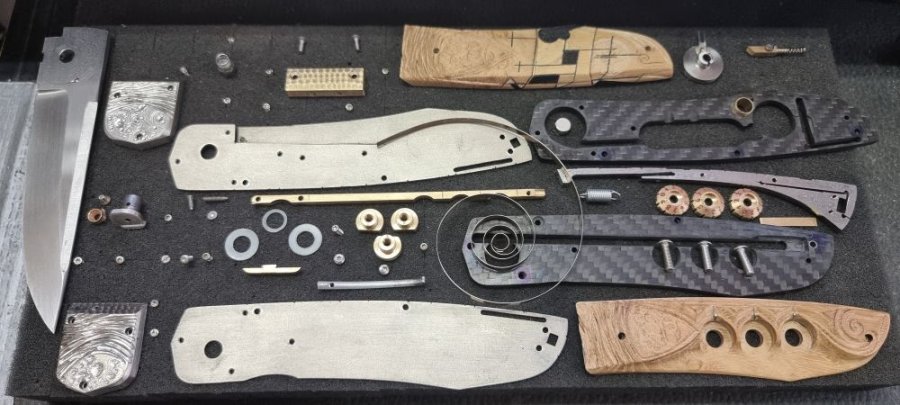 Il me fallait donc « inventer si possible » et combiner plusieurs mécanismes interactifs entre eux, mécaniquement fiables, de faible épaisseur, démontables au besoin, réversibles dans leur action afin de se fondre discrètement dans le manche d’un couteau pliant classique… Bien entendu, tout cela en rapport avec l’outillage disponible et mon expérience. Ce détail à son importance selon ma philosophie de création : « la main de l’artisan doit être capable de faire ce que la machine peut faire… avec, cela est inévitable, une précision moins importante, mais implique une pièce unique avec « ce petit quelque chose » qui caractérise son auteur, une âme, une authenticité… ».