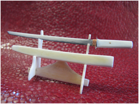 Chaque miniature unique est faite main à partir de matériaux nobles : acier pour les lames, ivoire pour les manches, bronze pour les gardes. Concernant les mini-couteaux pliants ou les ciseaux, les axes sont en or.