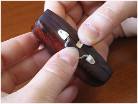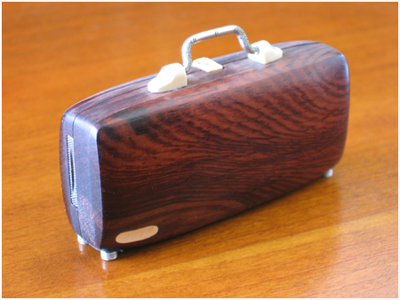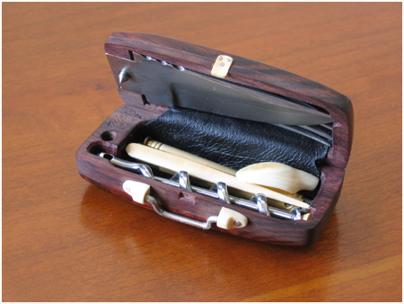 - Manche en palissandre de Madagascar évidé, doublage intérieur en cuir, détails en ivoire de mammouth et maillechort, assemblage par visserie inox, immobilisation des manches d’accessoires par aimant néodyme.