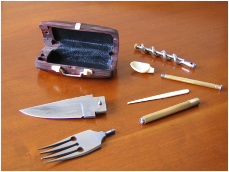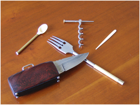 Mon interprétation du “couteau de voyage” réunit les ustensiles indispensables pour le voyageur poète épicurien partant à la découverte d’un nouveau monde, de nouvelles saveurs.