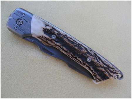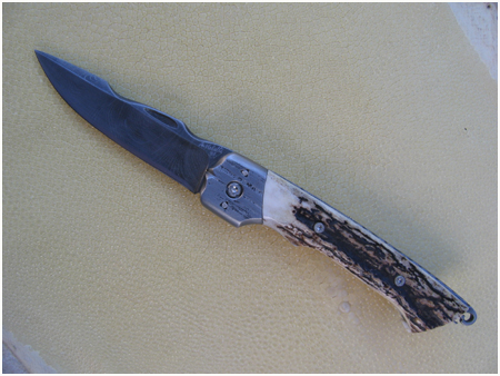La lame est en damas, la platine en acier carbone et le manche en stag indien (bois de cerf)