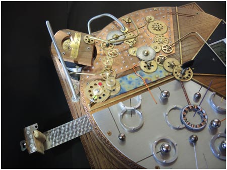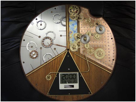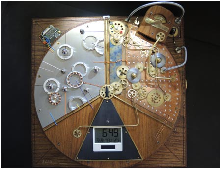 · Le passé par un assemblage de rouages divers, de tubes et de tuyaux sur plaque de cuivre rivetée.