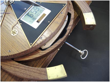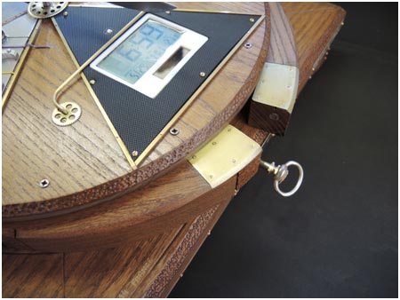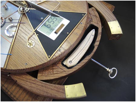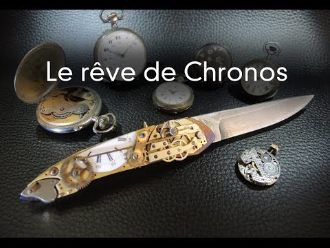 C’est un couteau à ouverture commandée par manivelle ; celle-ci est cachée dans le décor du manche. Une fois ouvert, il suffit d’installer le couteau sur la clef centrale, pointe dirigée vers le temps présent.