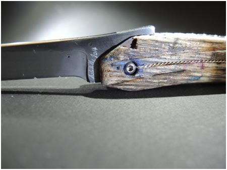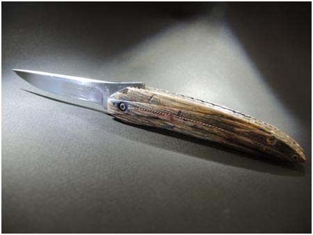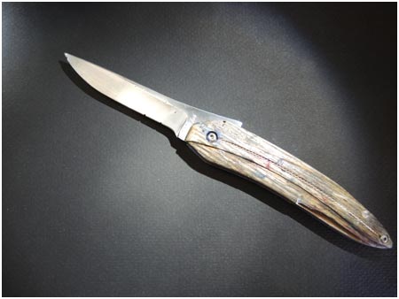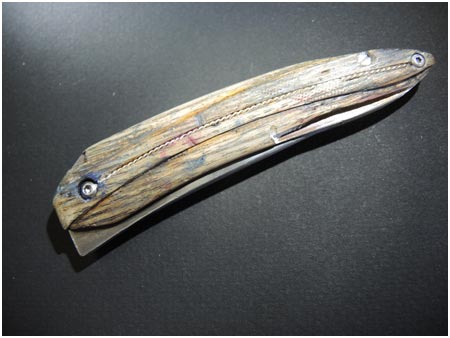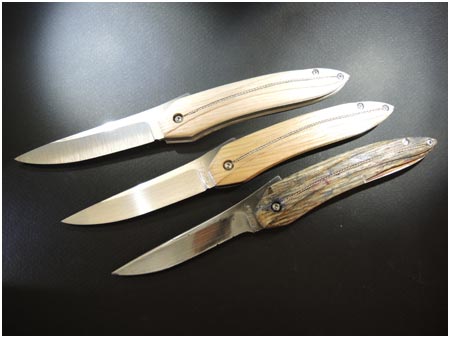 Le tiroir laisse apparaître un nouvel Éclat, à peine assemblé et en cours de fabrication. Le guillochage n’est pas terminé, l’émouture est à peine faite et un côté de manche brut n’est pas encore travaillé. C’est la « genèse » de l’Éclat et un côté de manche est brut, non travaillé.