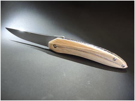 Tirons sur la poignée : deux portes s’ouvrent laissant apparaître un Éclat flambant neuf, logé dans un tiroir recouvert de feutrine noire. L’Éclat présenté est un modèle plein manche, bois d’acacias, insert de fil d’argent torsadé sur chaque face, le faux-ressort a un guillochage spécifique, les platines en titane sont colorées et guillochées.