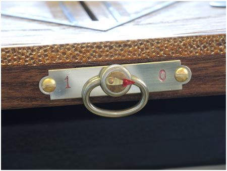 Pour finir ce voyage et partir déjeuner au restaurant avec le couteau de son choix, on remarque sur le côté droit, une molette en laiton. En actionnant celle-ci, on ouvre un tiroir frontal renfermant les étuis cuir en adéquation avec chaque couteau.