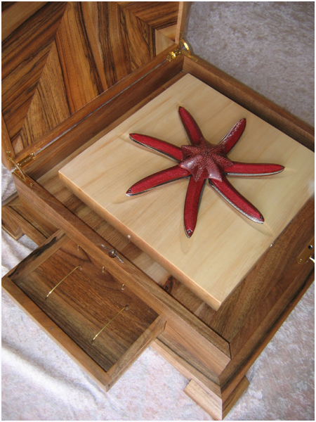 Afin de protéger cette création, Samuel REVET, ébéniste, a découpé et assemblé les éléments du coffret en noyer…