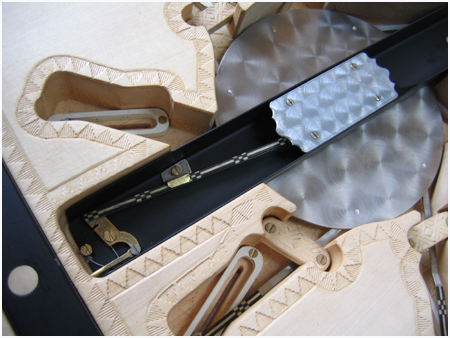 Tous les éléments ont été faits main et sont entièrement démontables. J’ai laissé le mécanisme apparent, visible grâce au reflet d’un miroir.