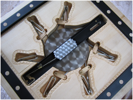 En tournant le « bouton sculpture » central dans le sens des aiguilles d’une montre, on arme le mécanisme ; le déclenchement se fait par un bouton latéral masqué qui libère très lentement les sept couteaux…