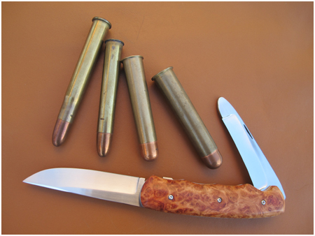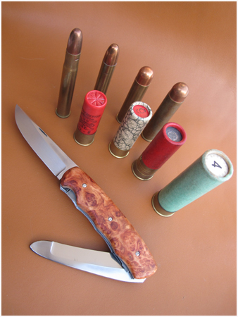 Présentation du couteau avec cartouches de grande chasses, 600, 500, 450 nitro-express, et calibre 12, 10, 8 et 4 !!