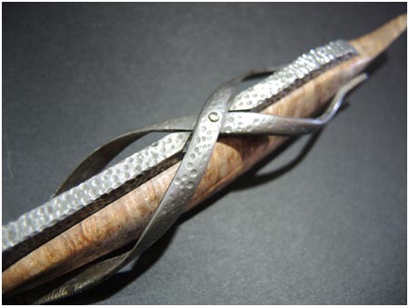 La soie externe s’enroule autour d’un manche en érable stabilisé et s’entrecroise sous celui-ci.