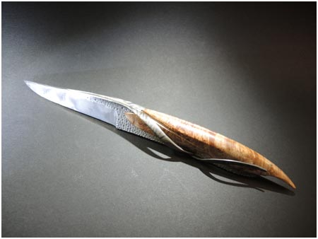 Ce pliant dans la série des refendus (après tramontane et mistral), voici le Zephir, vent doux et agréable, en rapport avec la légèreté apparente du dessin de ce couteau fixe.