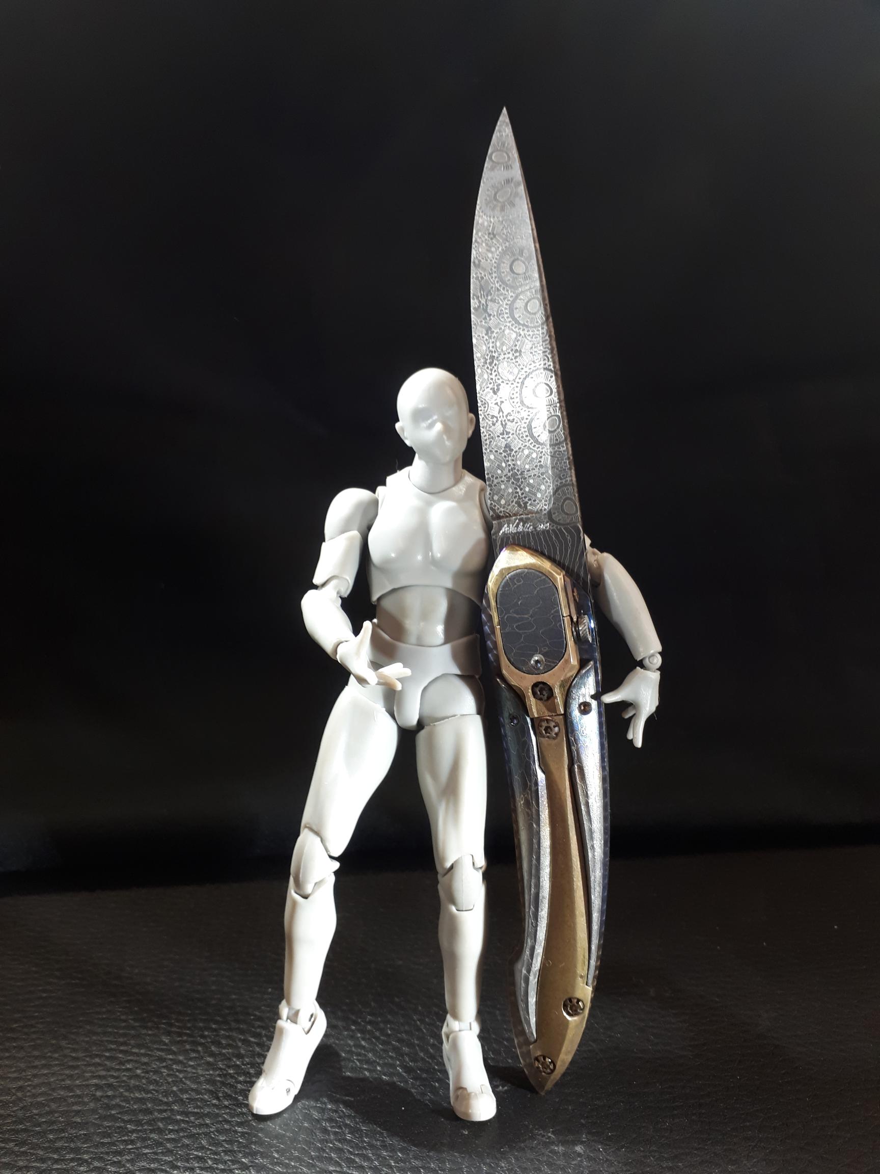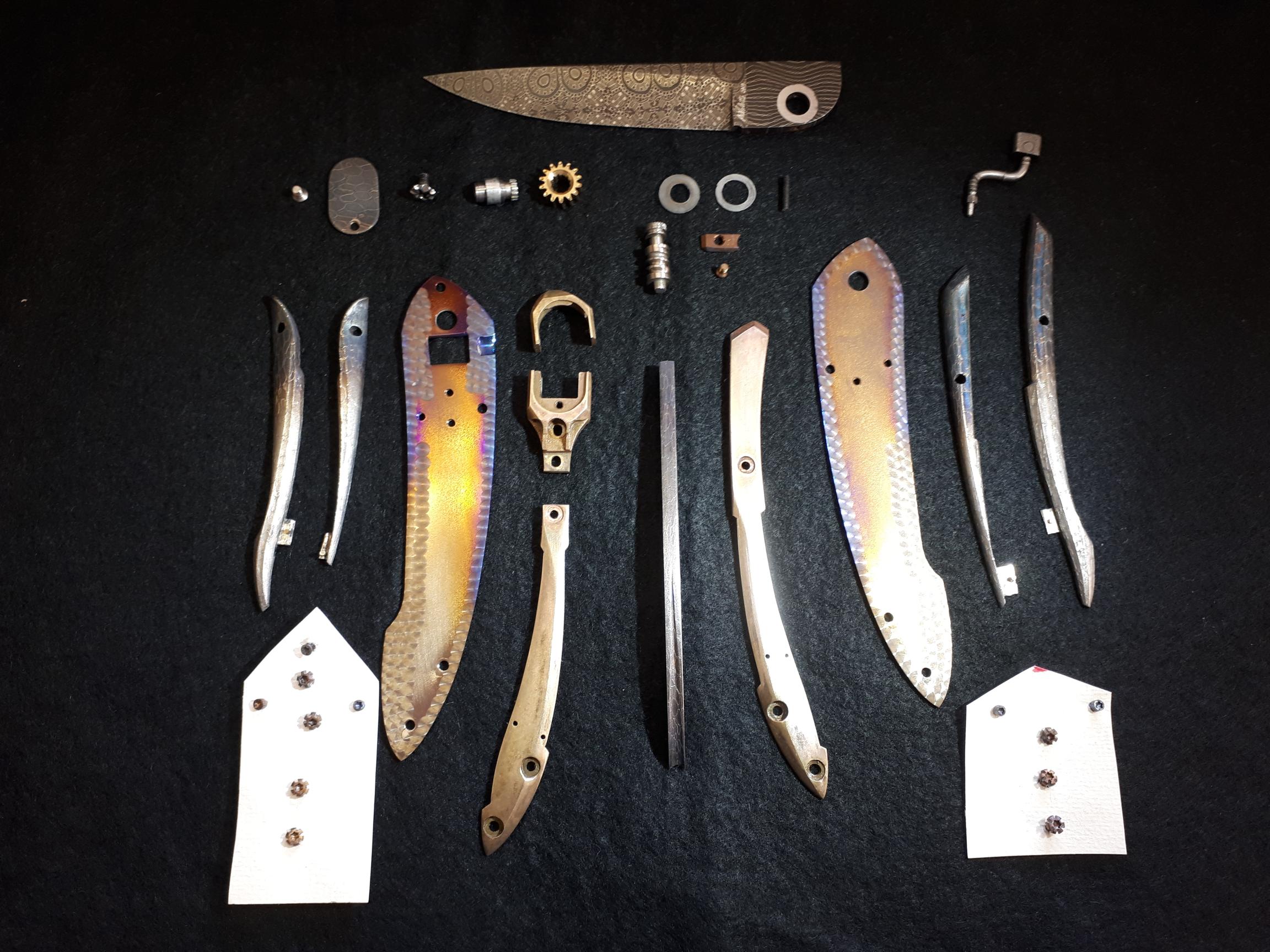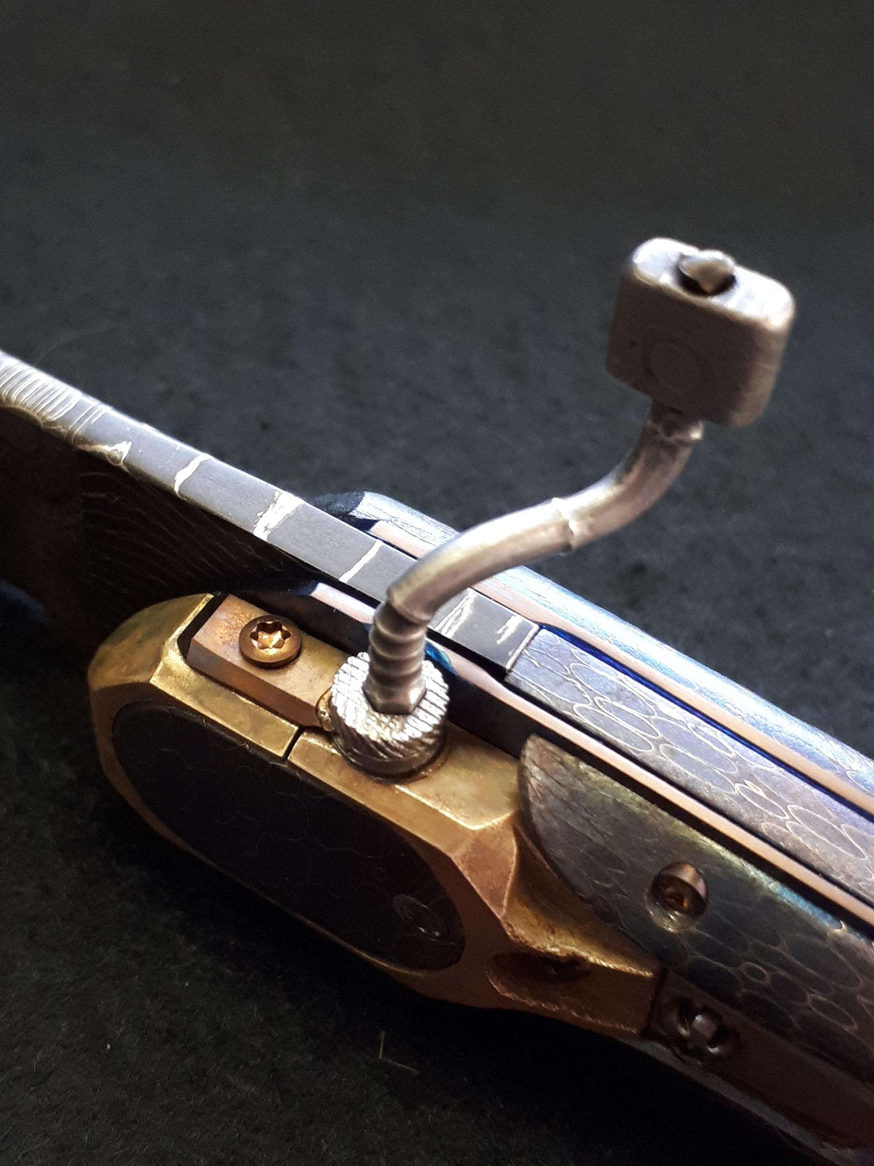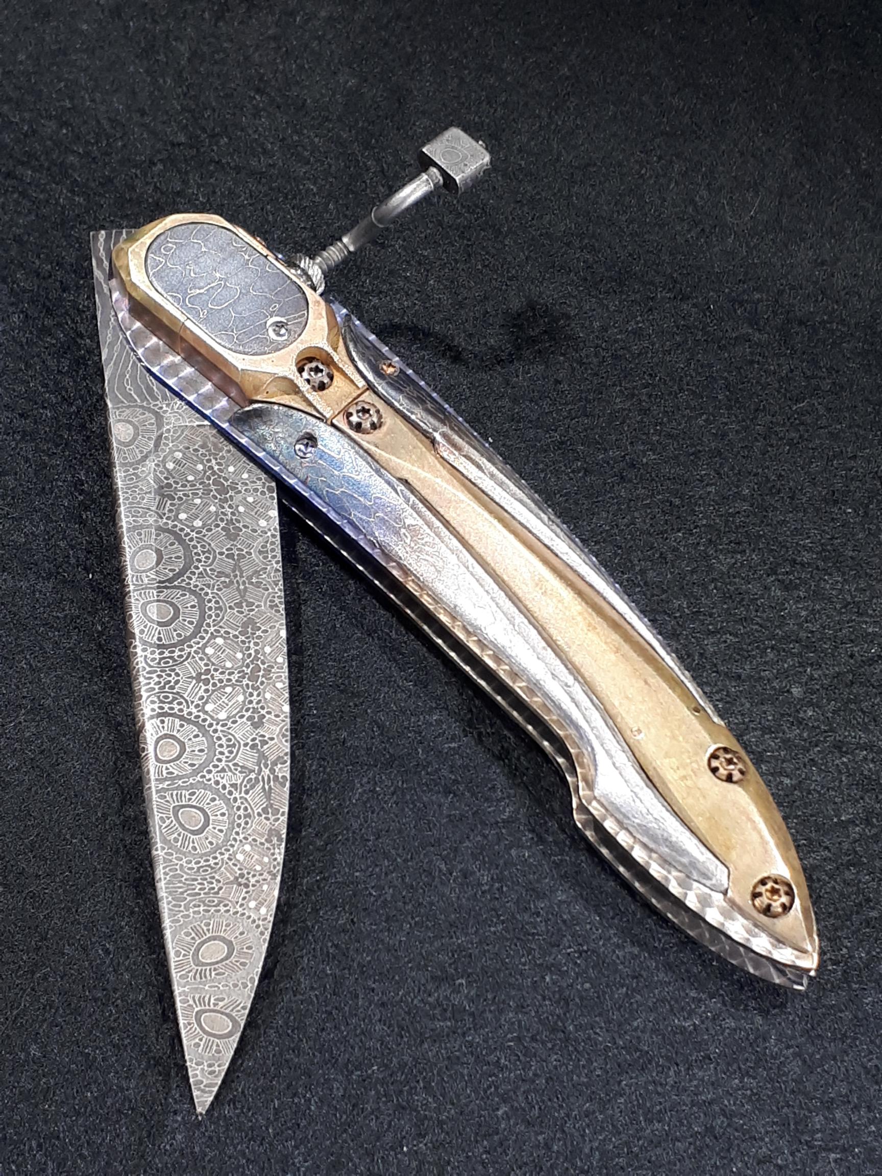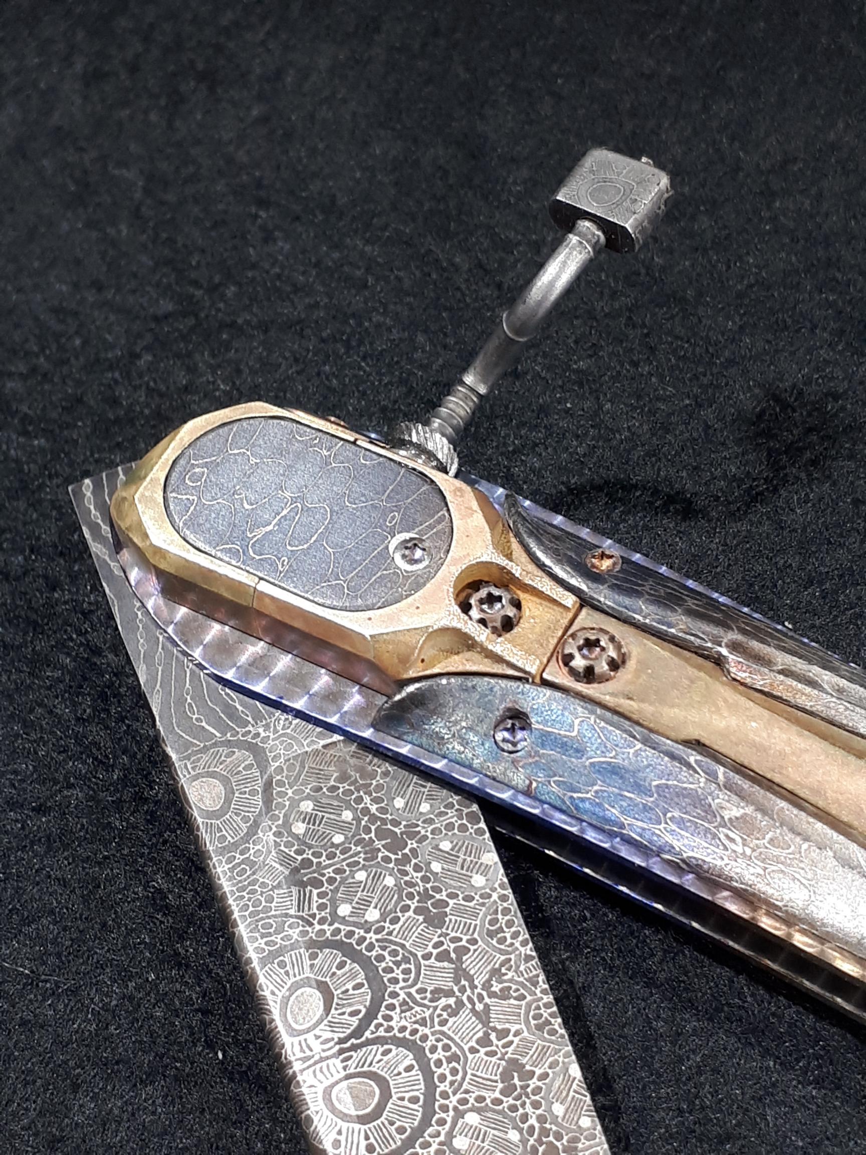 Platine en titane, boîtier et pièce centrale en bronze, manche en damas de bertie rietvelt Afrique du Sud, lame en mosaïque de Etore GIANFERRARRI Afrique du Sud