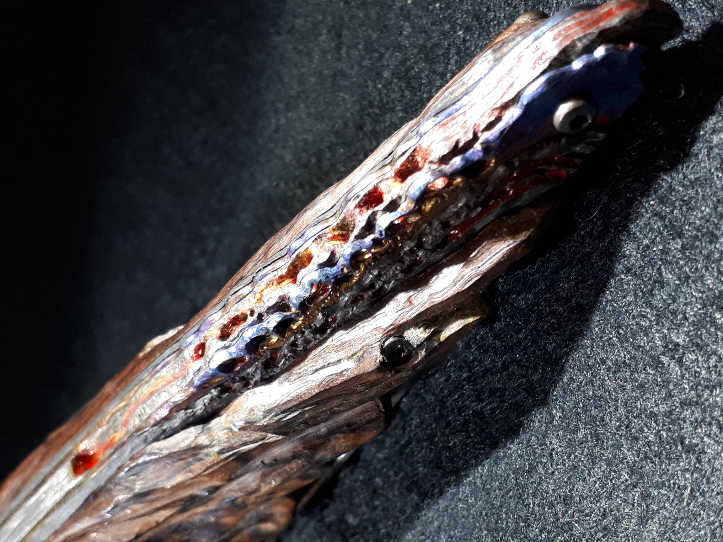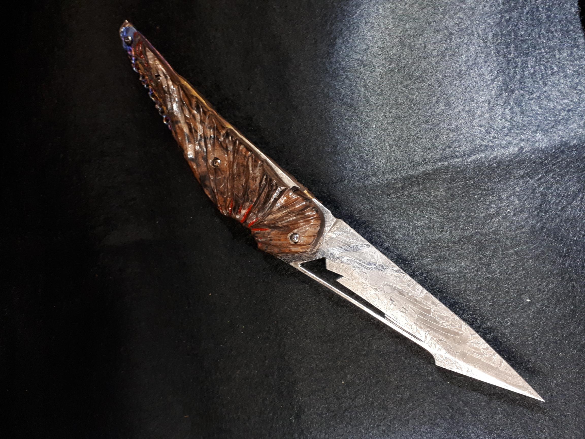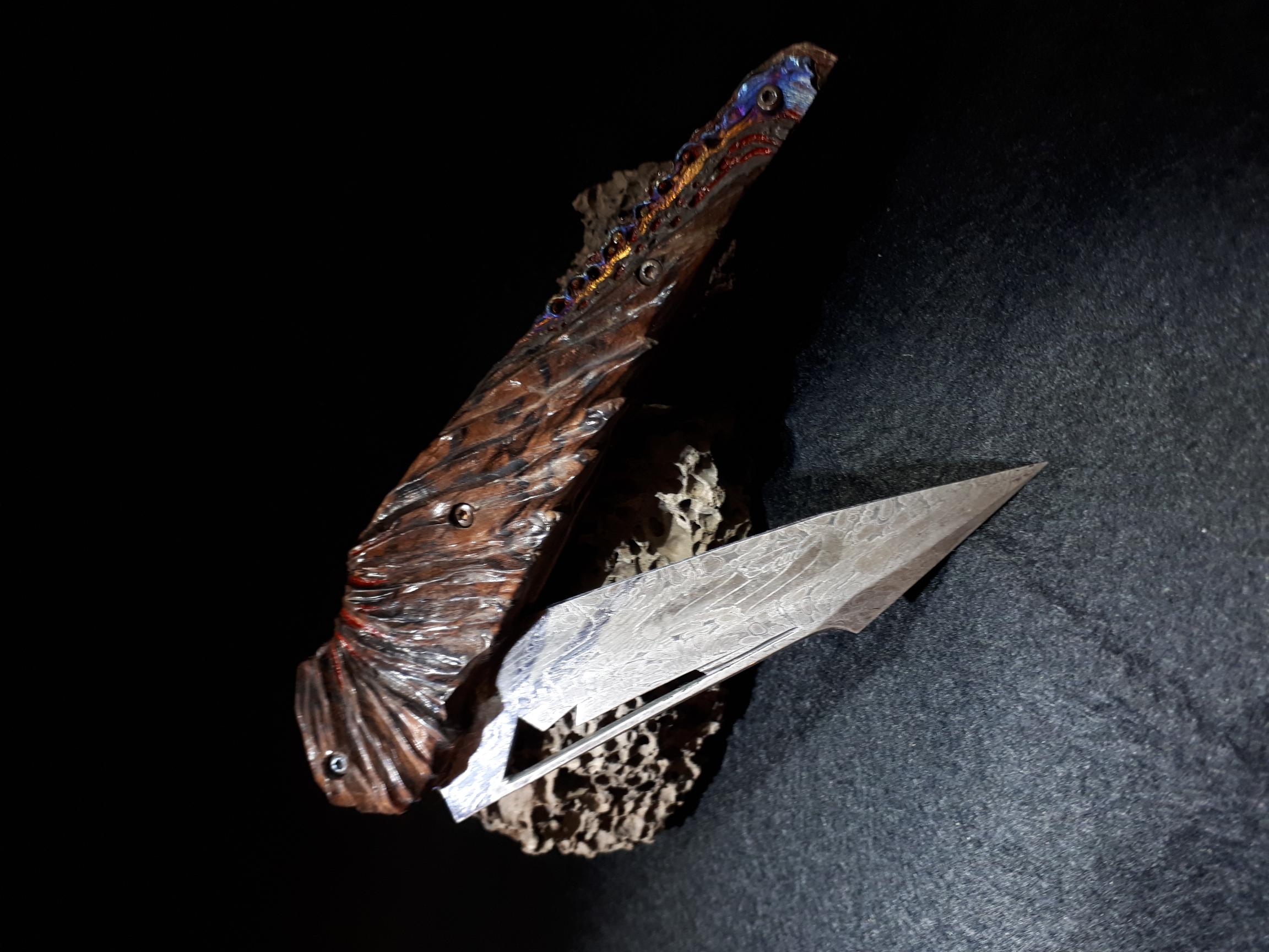 Acier damas ,manche en bois précieux sculpté, ciselé, décors rehaussés de peinture émail à froid... Coulée de lame ciselée dans de la fibre de carbone et feuille titane coloré a la flamme.