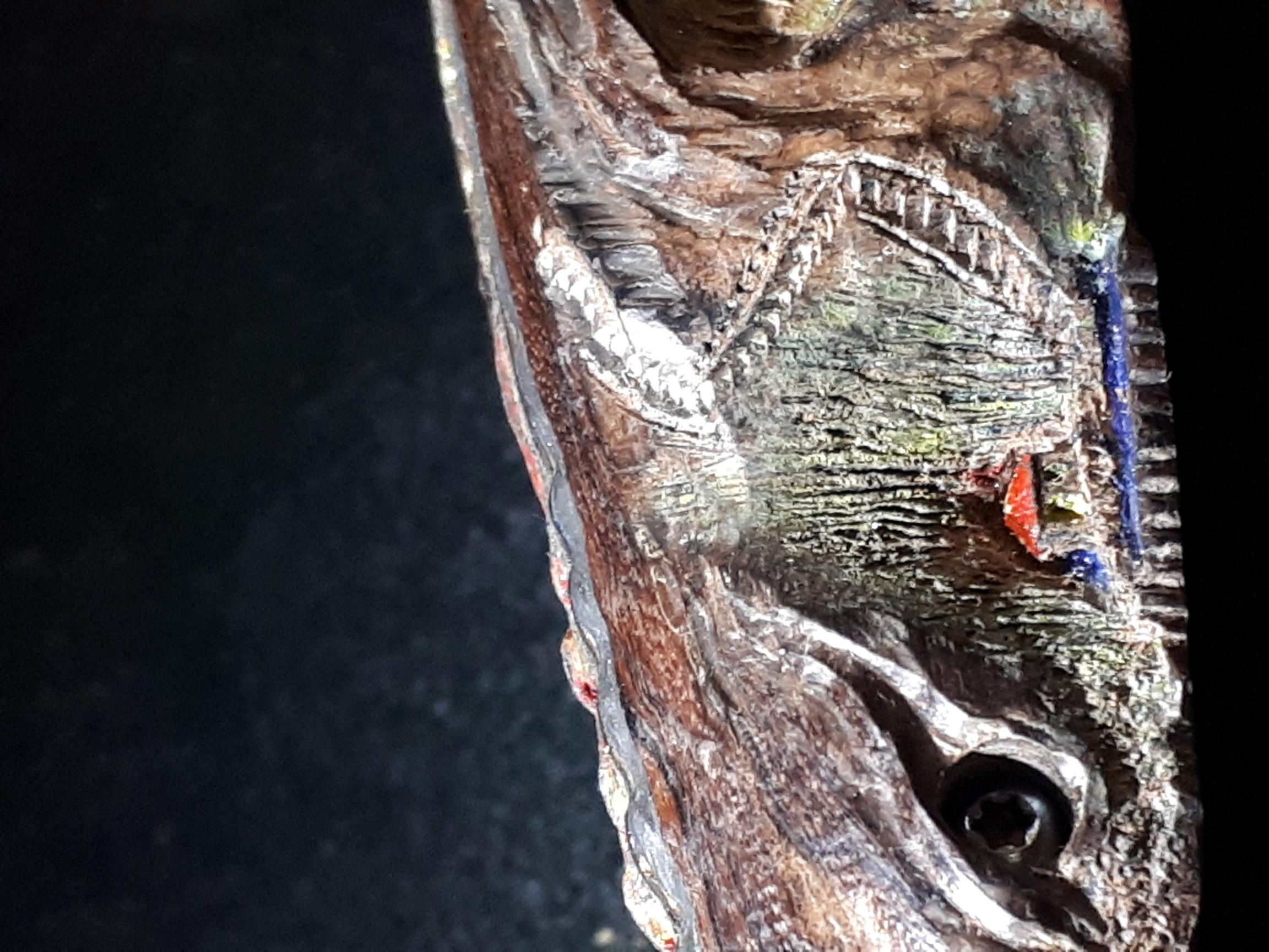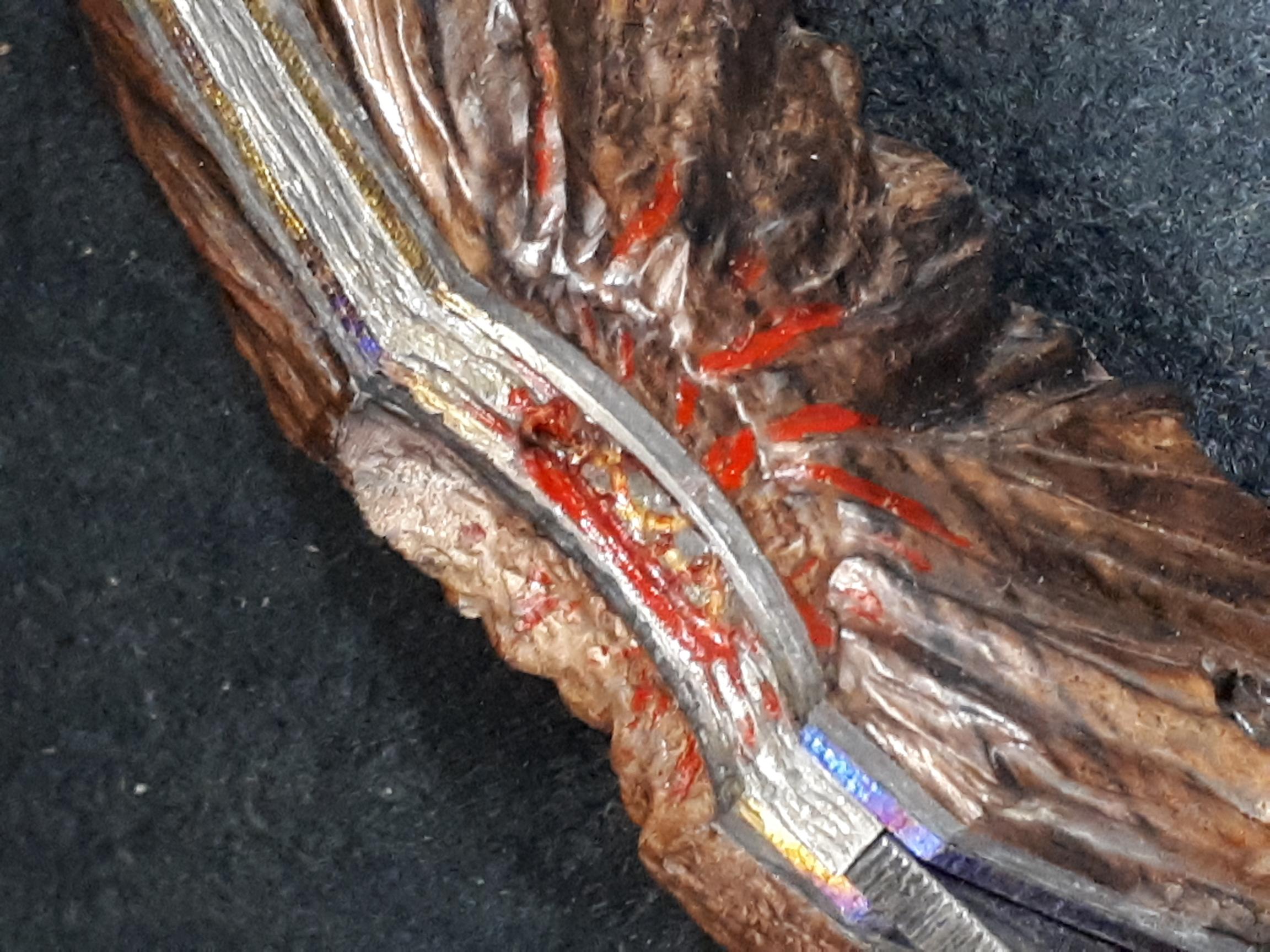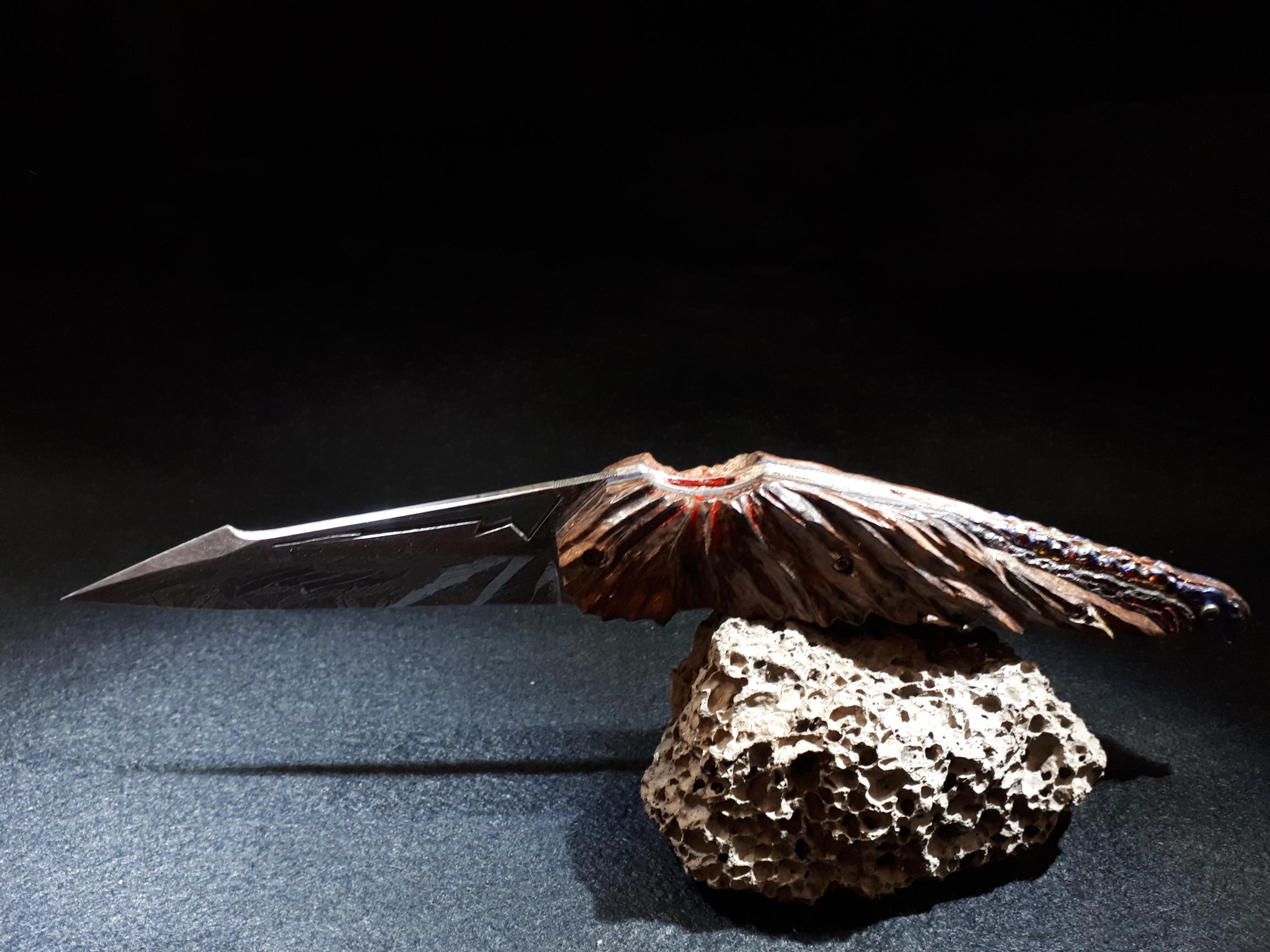 Acier damas ,manche en bois précieux sculpté, ciselé, décors rehaussés de peinture émail à froid... Coulée de lame ciselée dans de la fibre de carbone et feuille titane coloré a la flamme.